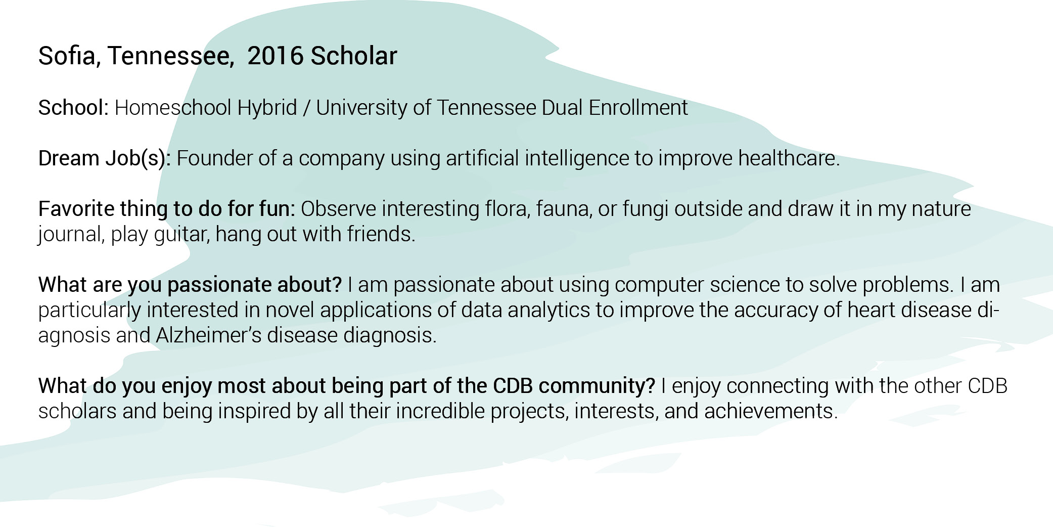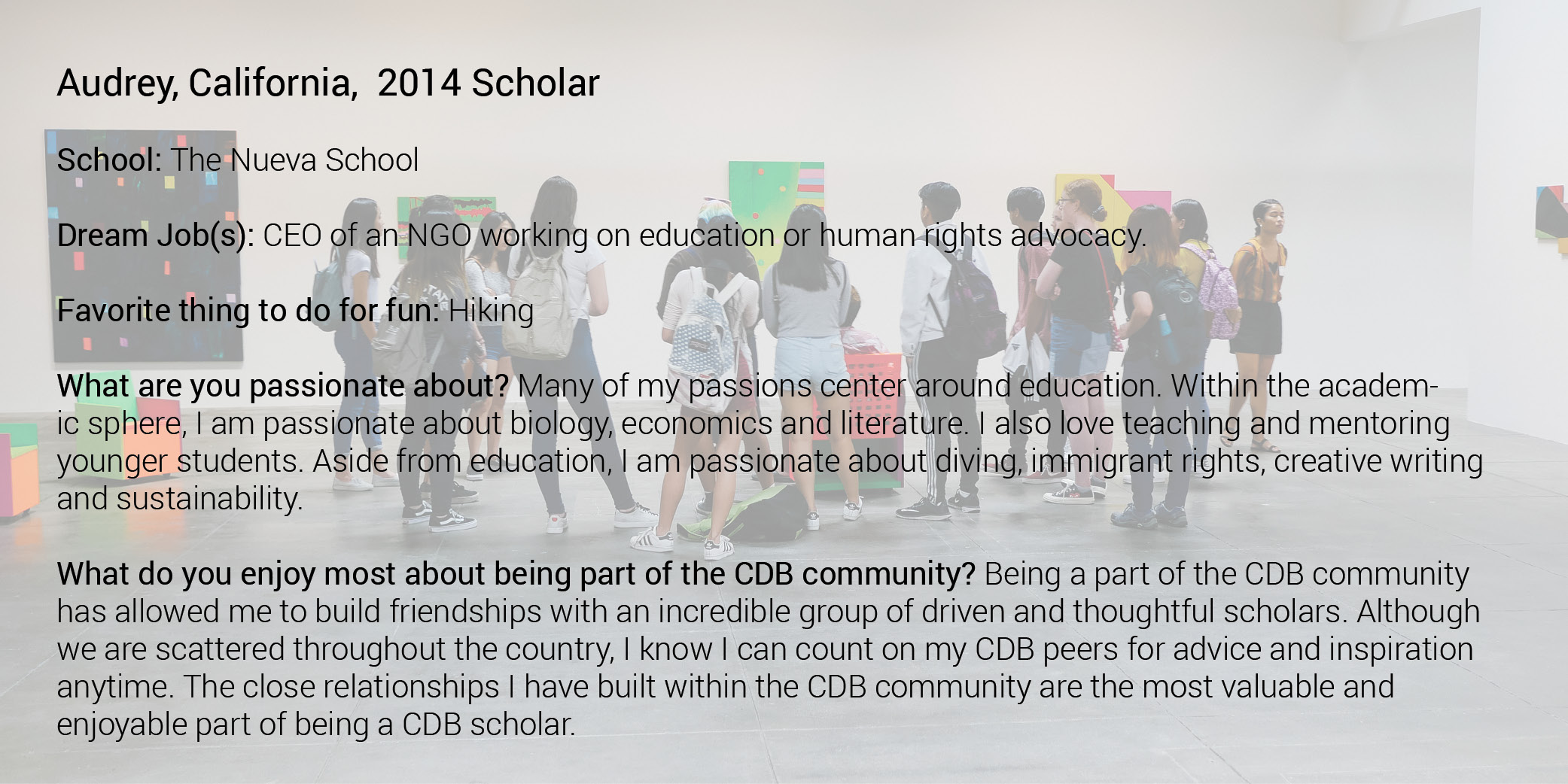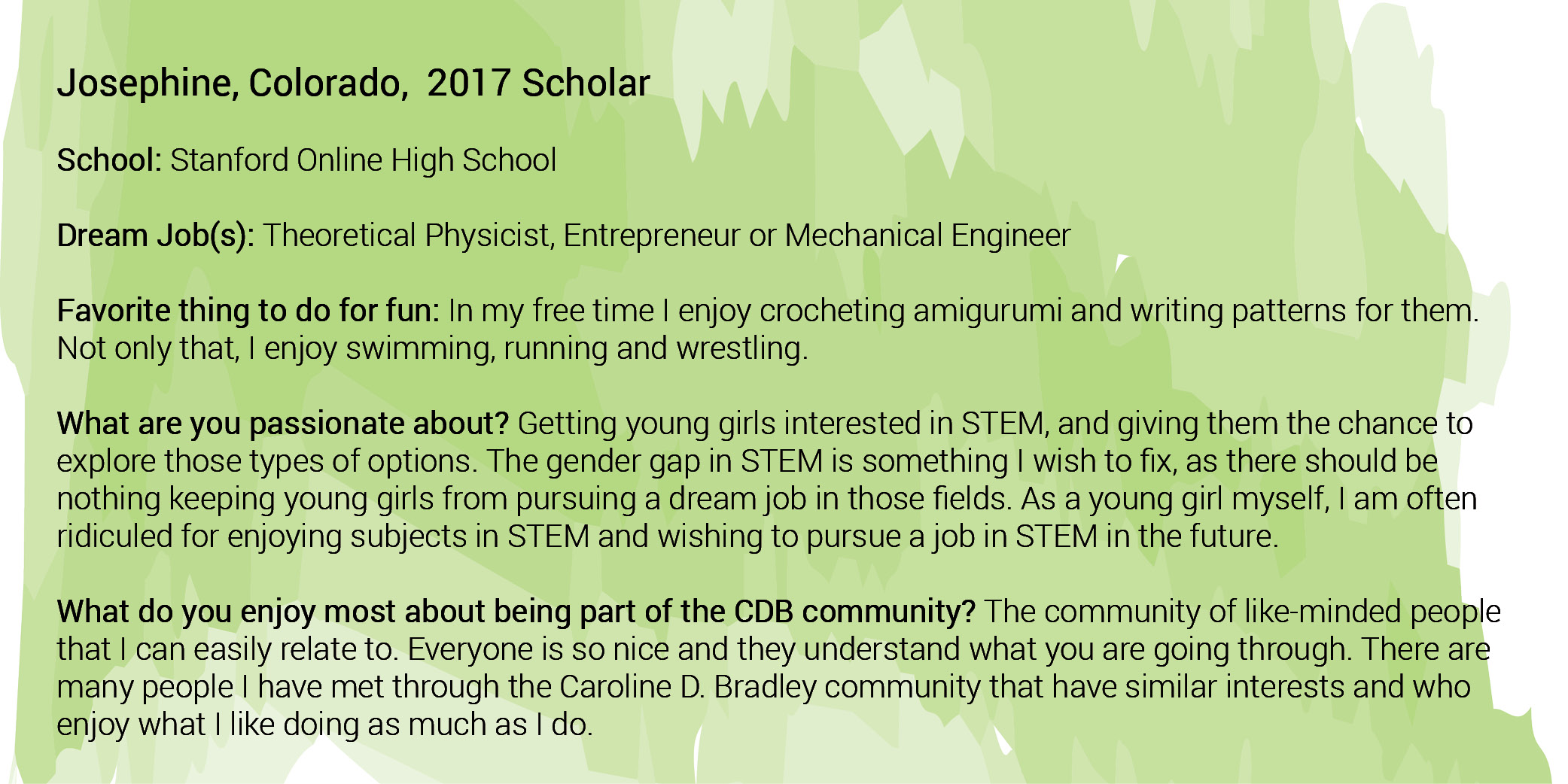 A Caroline D. Bradley Scholar is a young student who excels academically, displays a genuine quest for knowledge, thrives in the discovery process, is a leader among peers, and embraces the ideals of integrity, service, and honesty. CDB targets exceptionally gifted young people who seek a rigorous, diversified high school program but need assistance finding or attending the appropriate learning environment that will help them work towards and achieve their full potential. Through a highly selective, in-depth portfolio application and interview process, CDB annually identifies exceptional 7th grade students from across the country who best meet the following criteria:
