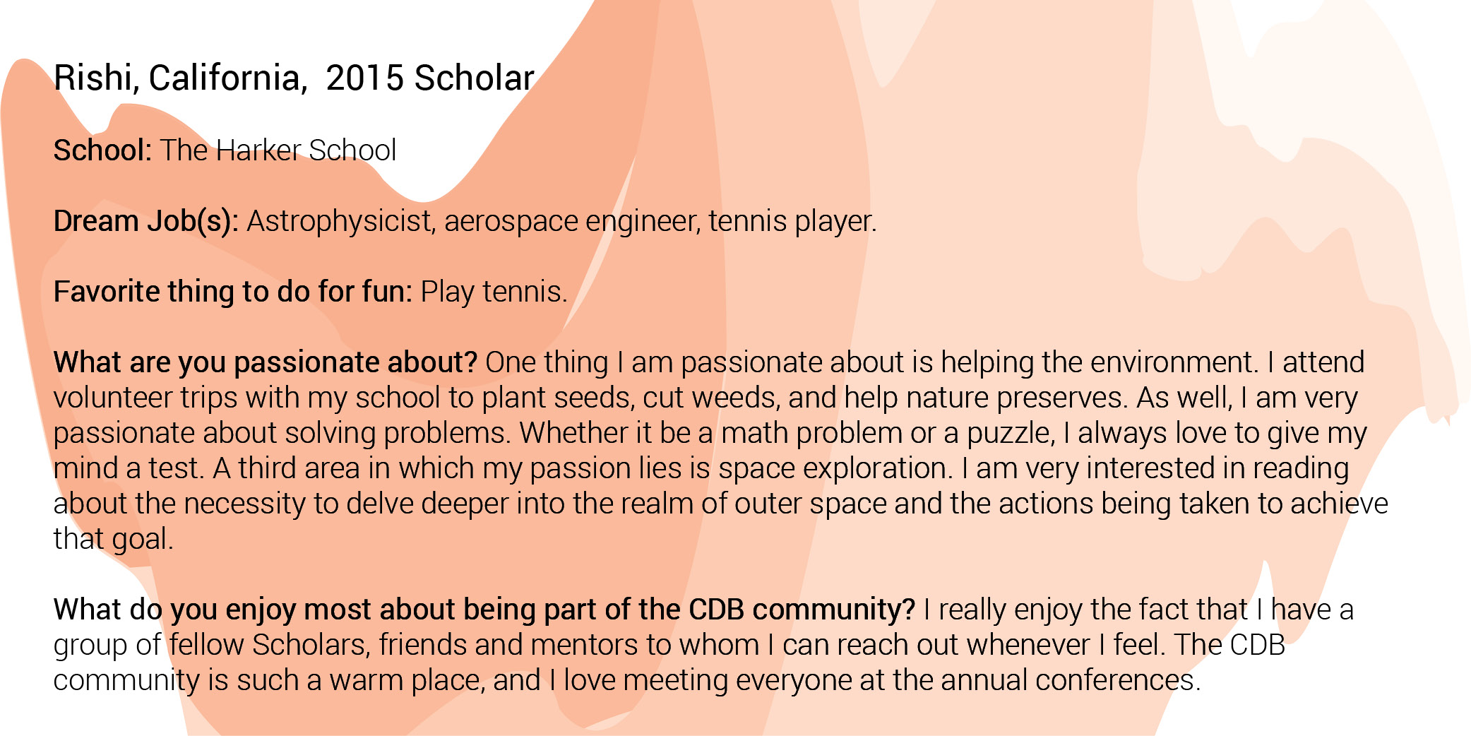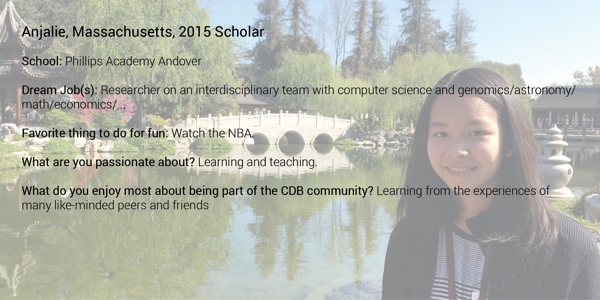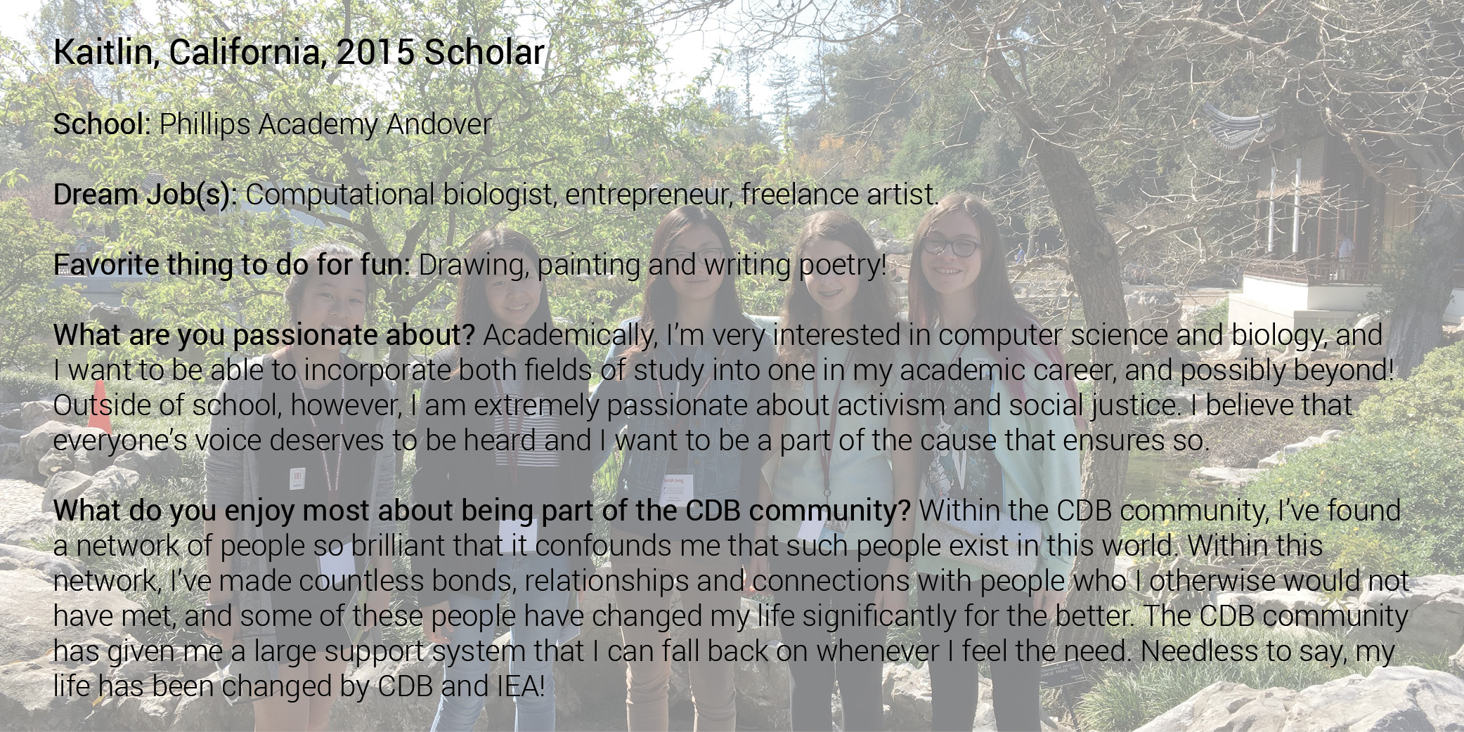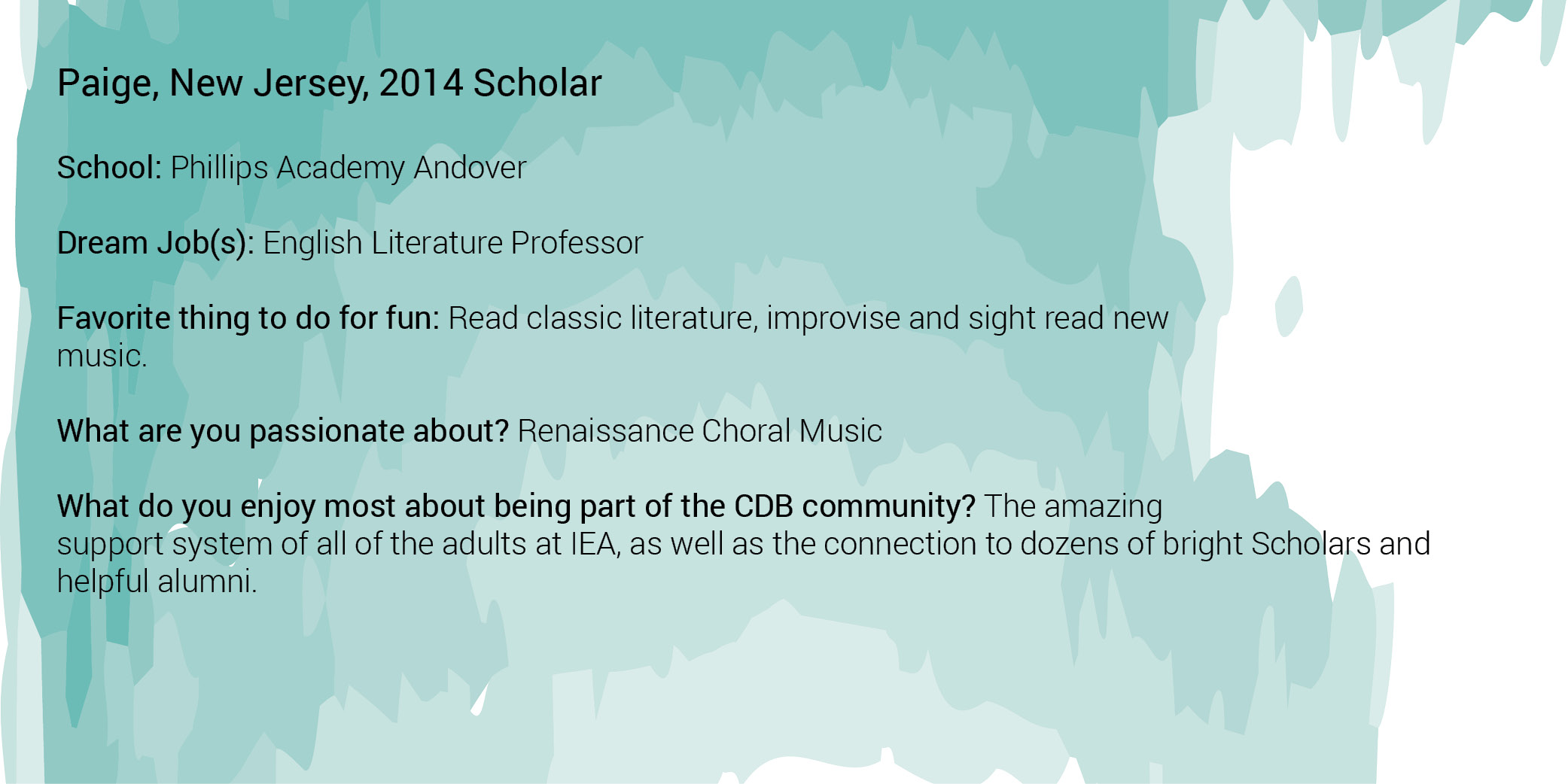 A Caroline D. Bradley Scholar is a young student who excels academically, displays a genuine quest for knowledge, thrives in the discovery process, is a leader among peers, and embraces the ideals of integrity, service, and honesty. CDB targets exceptionally gifted young people who seek a rigorous, diversified high school program but need assistance finding or attending the appropriate learning environment that will help them work towards and achieve their full potential. Through a highly selective, in-depth portfolio application and interview process, CDB annually identifies exceptional 7th grade students from across the country who best meet the following criteria: