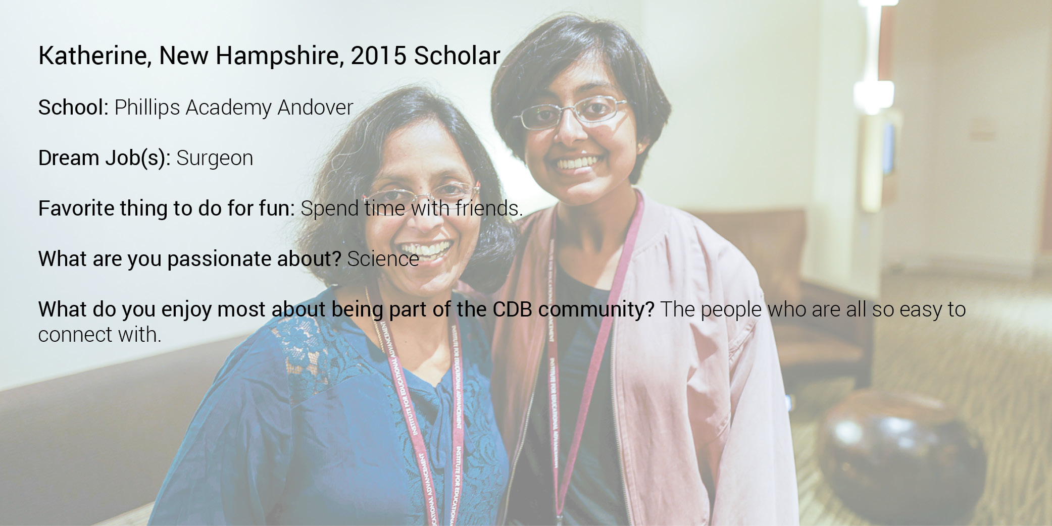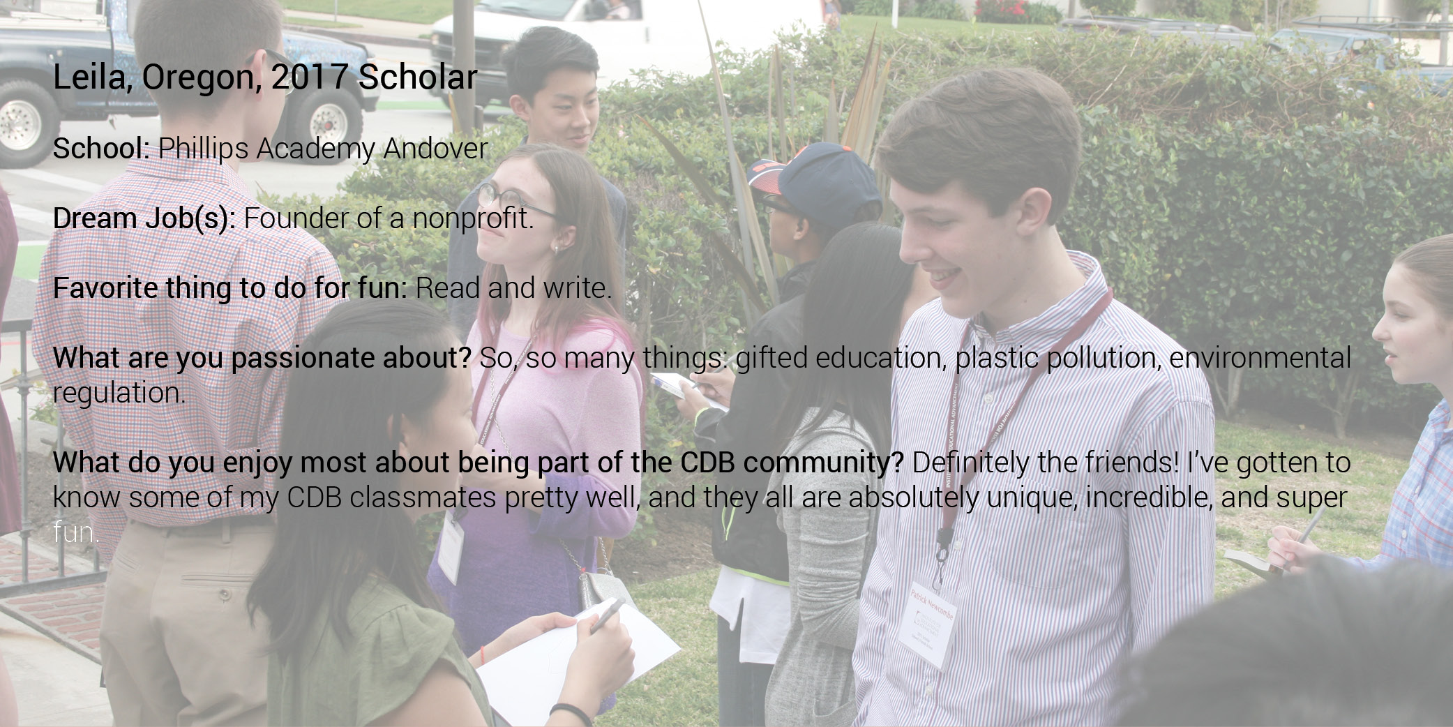 A Caroline D. Bradley Scholar is a young student who excels academically, displays a genuine quest for knowledge, thrives in the discovery process, is a leader among peers, and embraces the ideals of integrity, service, and honesty. CDB targets exceptionally gifted young people who seek a rigorous, diversified high school program but need assistance finding or attending the appropriate learning environment that will help them work towards and achieve their full potential. Through a highly selective, in-depth portfolio application and interview process, CDB annually identifies exceptional 7th grade students from across the country who best meet the following criteria: